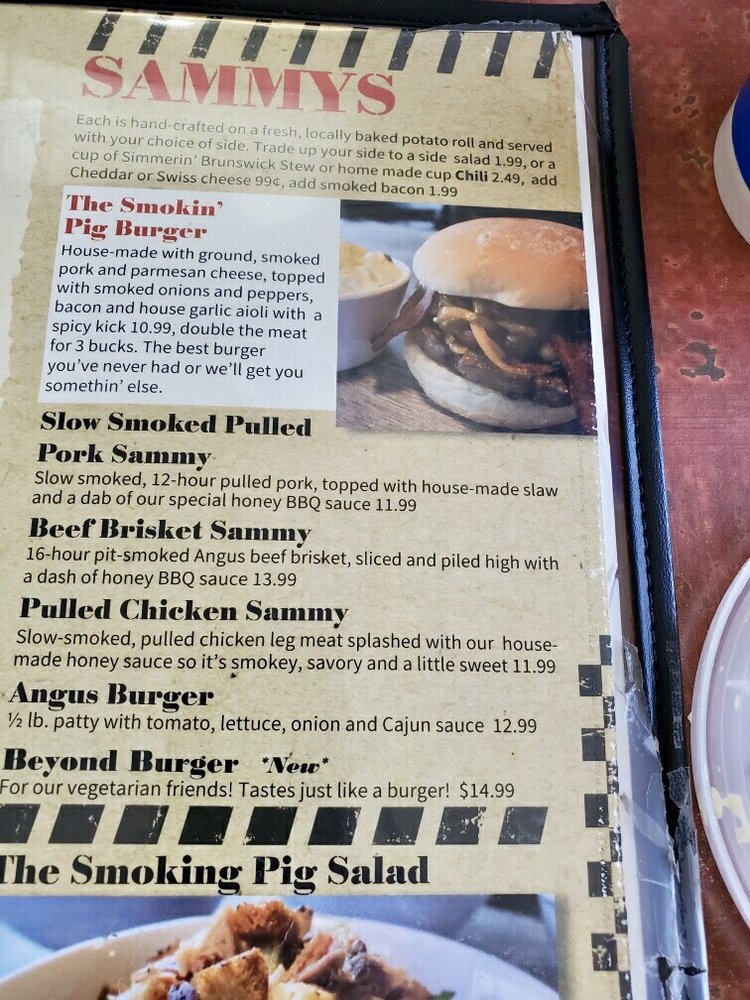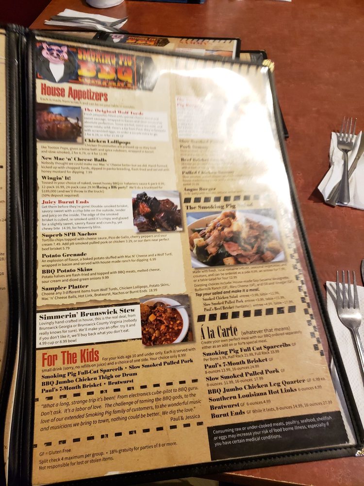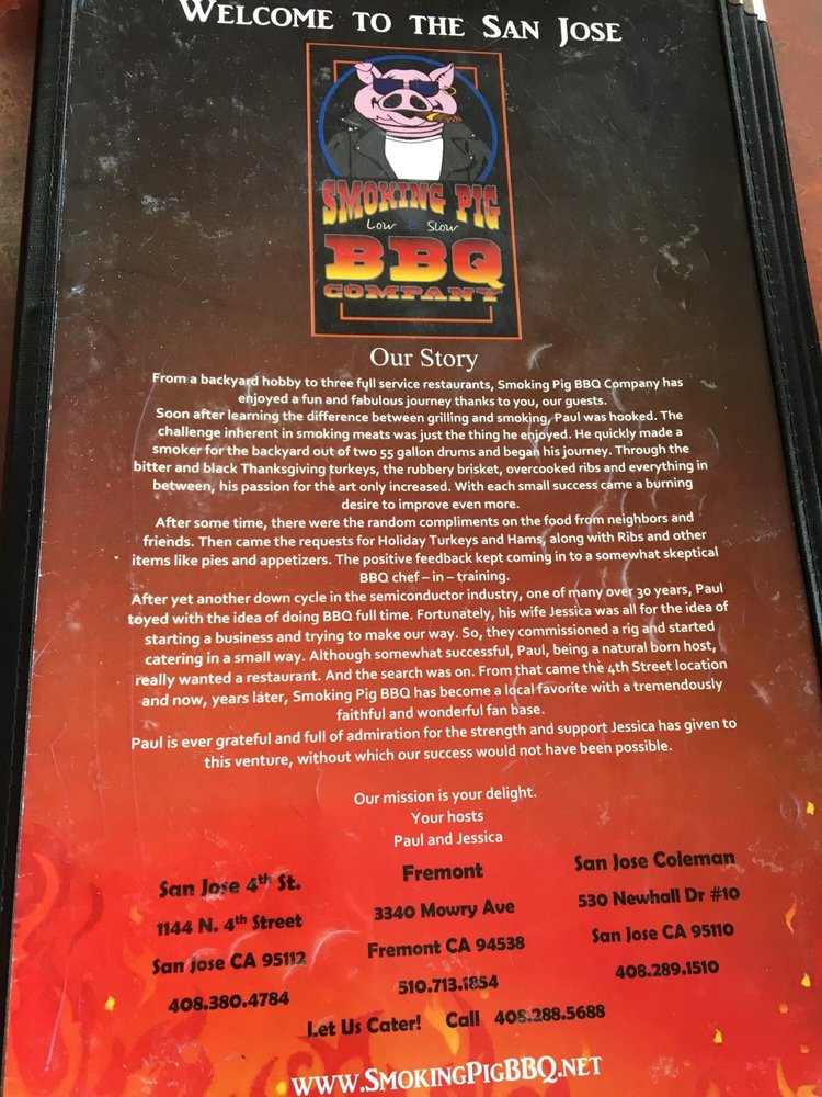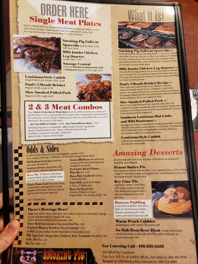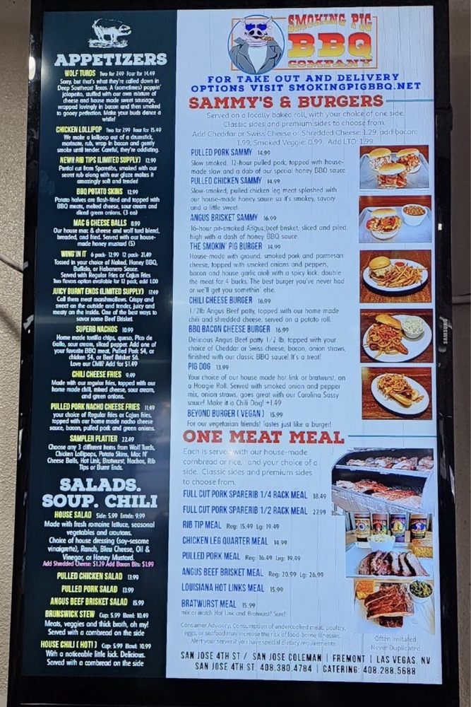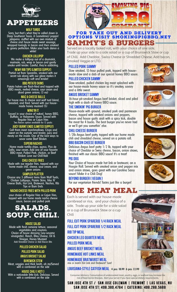Smoking Pig BBQ, located in San Jose, offers a casual dining experience with a variety of mouth-watering BBQ options. Their menu includes appetizers like Wolf Turds, BBQ Potato Skins, and Burnt Ends, as well as salads and Sammy's & Burgers like the Pulled Pork Sammy and Beef Brisket Sammy. Customers rave about the flavorful meats and homemade BBQ sauces, with highlights being the mac n cheese, ribs, and brisket. The restaurant's interior has a nostalgic feel, but some reviewers have noted the need for a refresh. Overall, Smoking Pig BBQ is a great spot for delicious BBQ at a moderate price, ideal for groups and families seeking a casual dining experience.