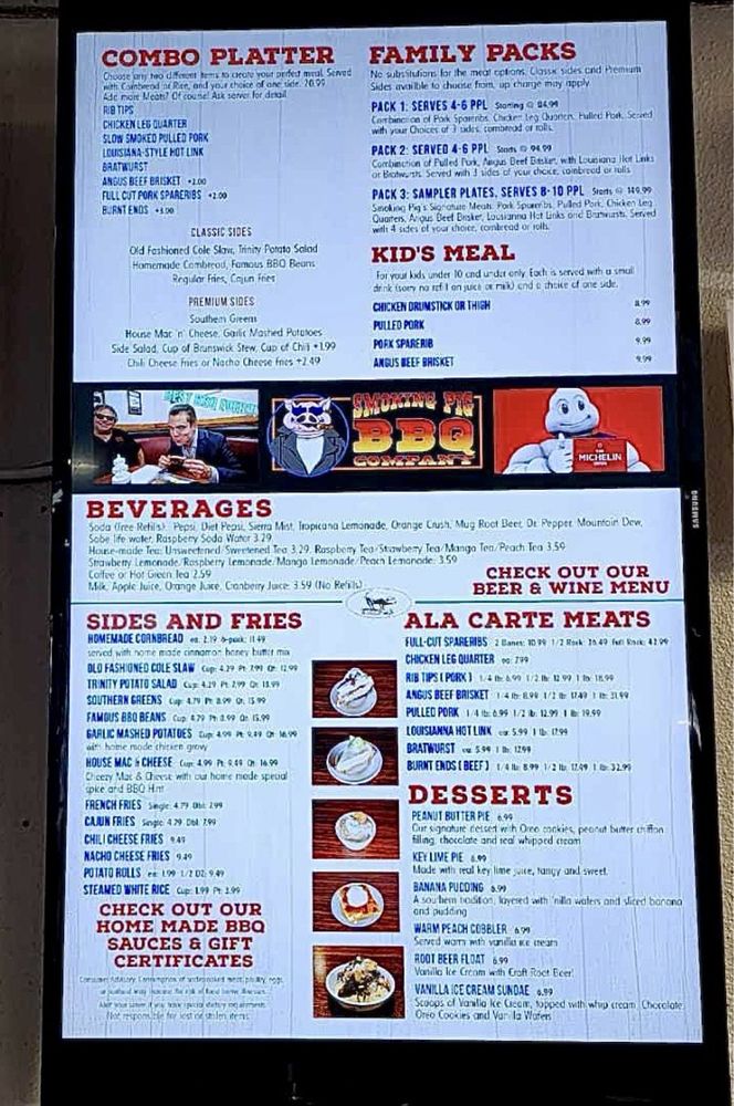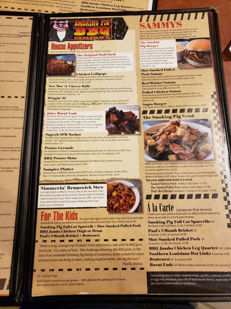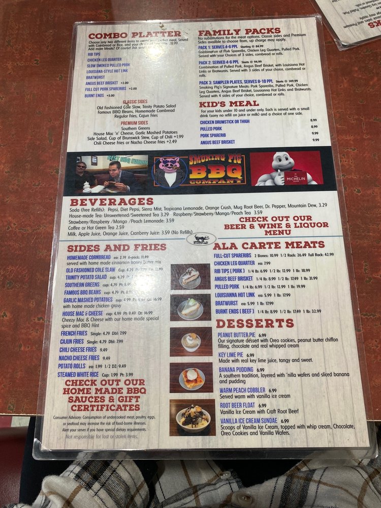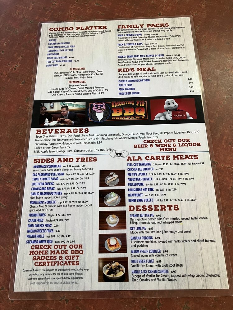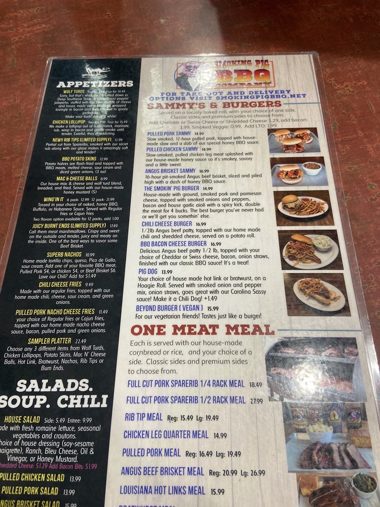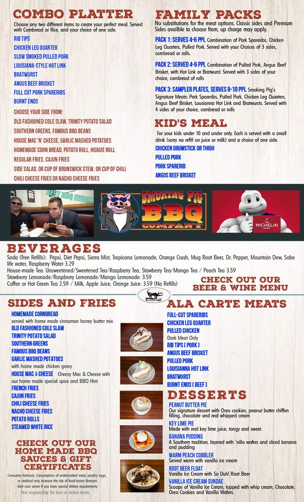 Smoking Pig's Signature Meats: Pork Spareribs, Pulled Pork, Chicken Leg Quarters, Angus Beef Brisket, Lousianna Hot Links. Served with 3 sides of your choice, cornbread or rolls.